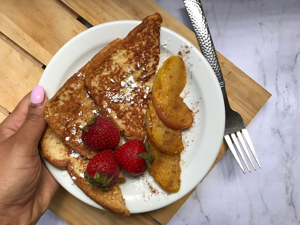 Top toast with apple slices and powdered sugar (if desired) and enjoy! The toast is soooo moist and the apples are so sweet you can eat these plain without syrup.